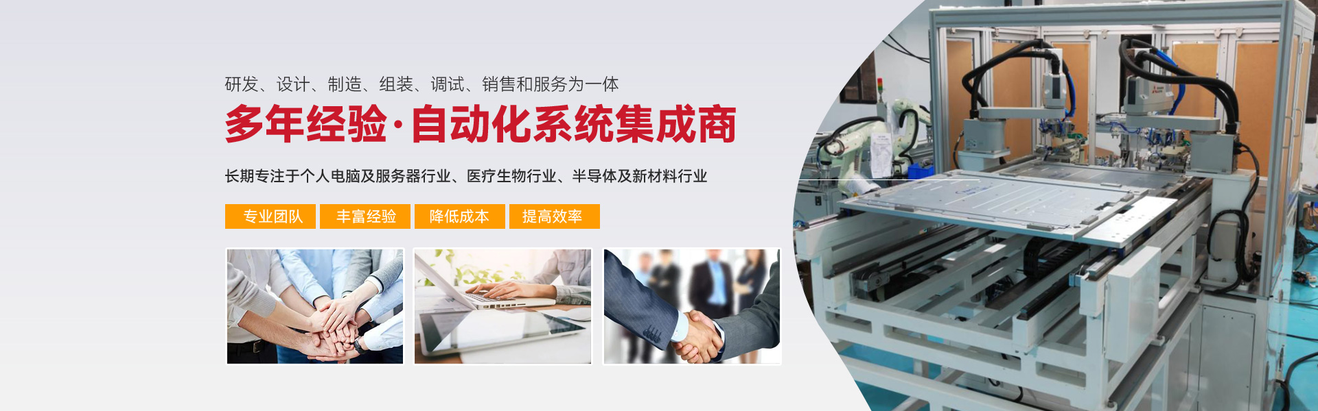 ※ 長期專注亍個人電腦及服務器行業(yè)、醫(yī)療生物行業(yè)、半導體及新材料行業(yè)三大行業(yè)的自動化組裝、檢測設備的生產(chǎn)與開發(fā)。